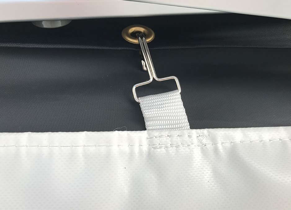 The gutter is kept in its place with two separate connections. The first connection consists of sewing the edges of the gutter with hooks, loop straps, or snap clips that attach to the valence on the top inside.