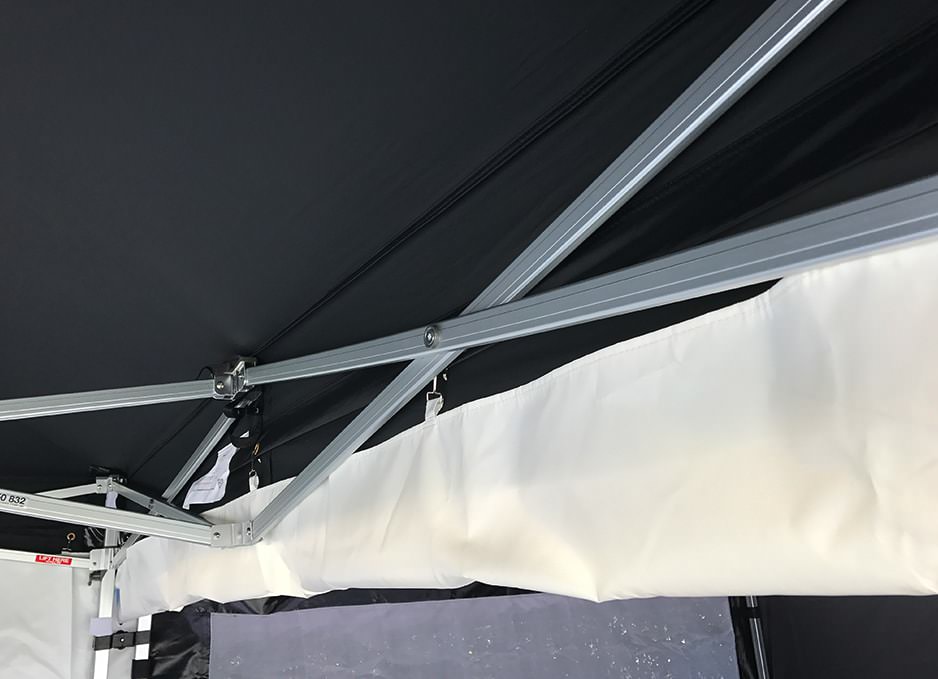 The Extreme Marquees rain gutter can be easily hooked on to the ceiling of your marquee to collect the water. This helps you keep the place between the two marquees dry and drip-free.